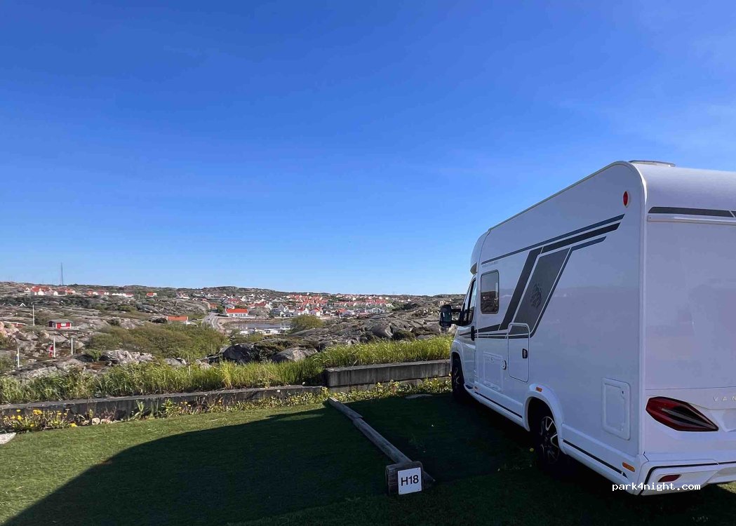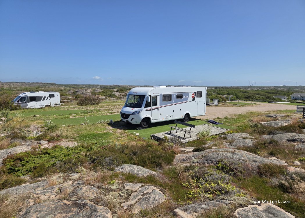 Superhärlig camping! Fantastisk personal och trevliga husbilsplatser med en liten konstgräsplätt vid varje plats. Lite blåsigt men fantastisk utsikt. Nära till smögen. Rena servicehus, dock 5 kr för dusch/4 min. 250 kr för en natt. Återkommer gärna!