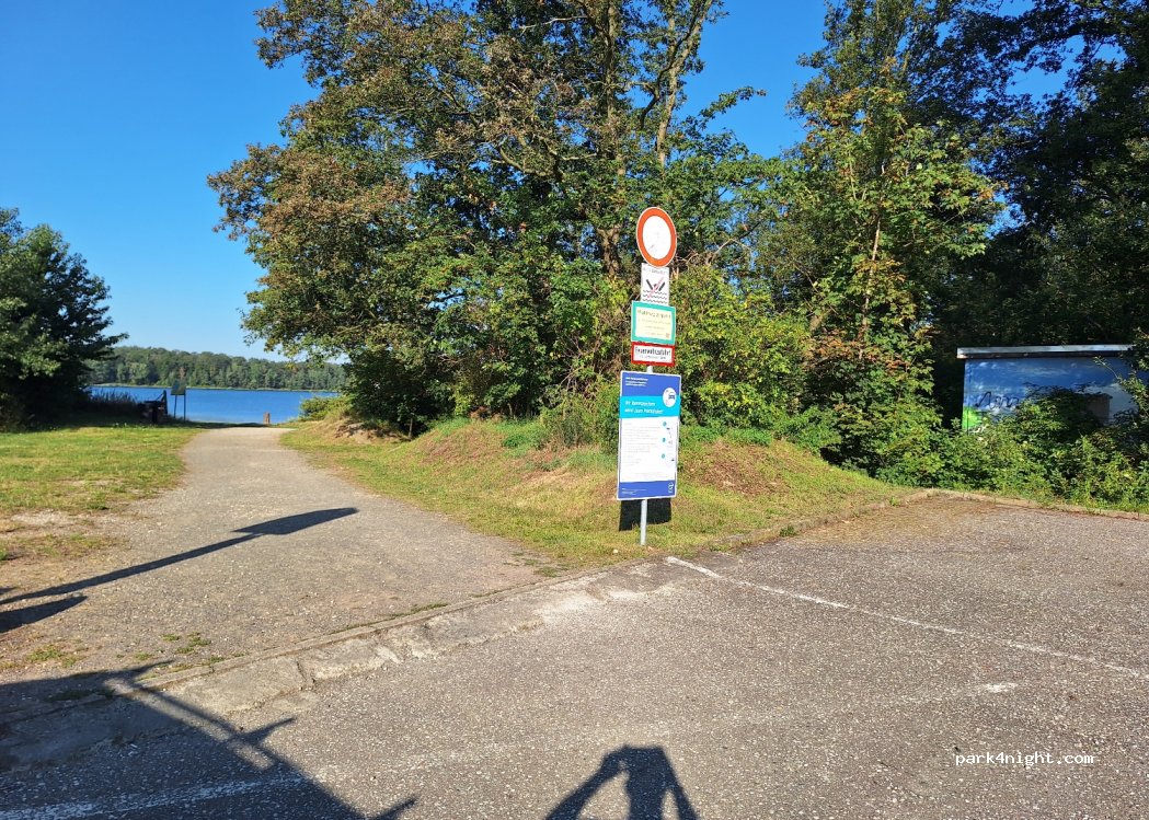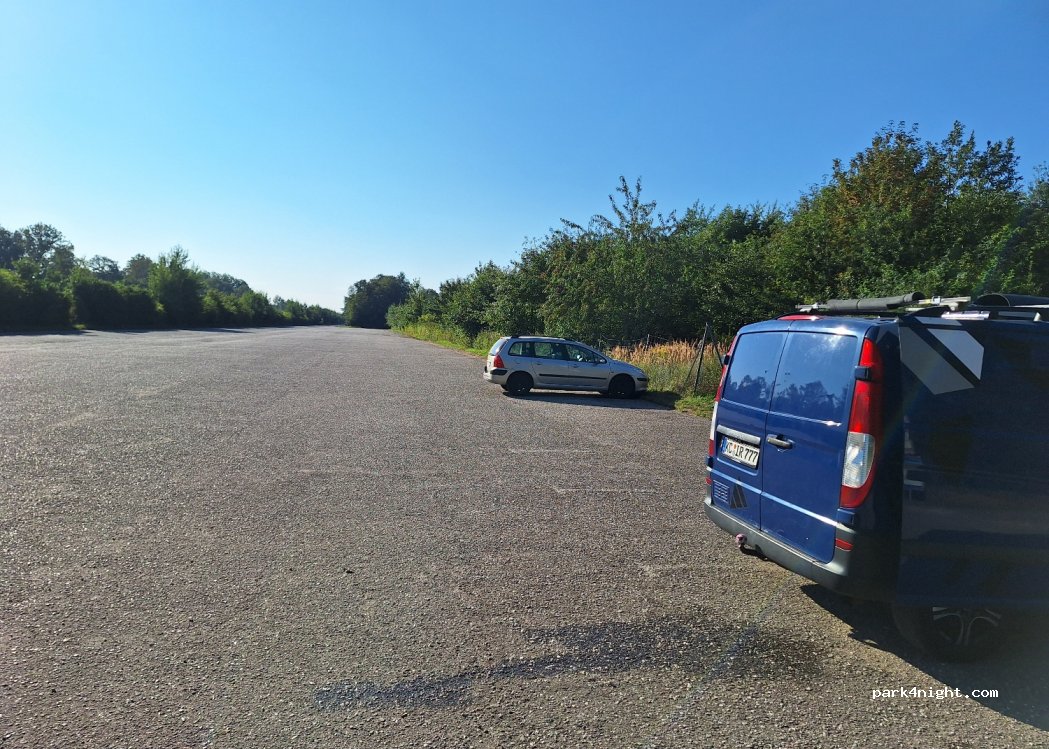 Parkplatz direkt an einem schönem Badesee. Waren dort für 2h zum abkühlen, auch mit Hund kein Problem. Kleiner Imbiss mit Cocktails, Eis und anderem essen. Digitale Parken über kennzeichenerkennung, hat super easy funktioniert.