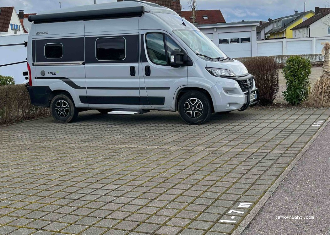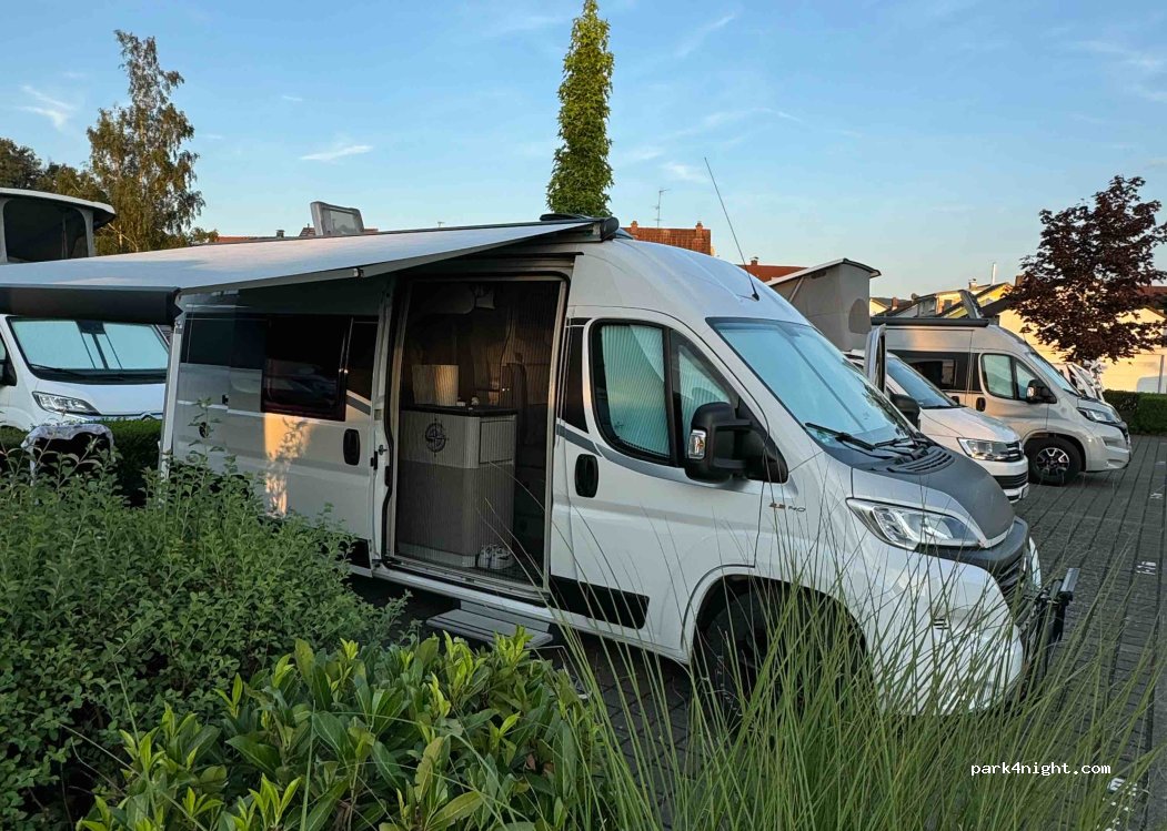6m99 long/3m20 high. Easy access. CP in the middle of a residential area. Flat, paved and well maintained. For us too much noise from road, railroad, airplanes. It’s a constant buzzing noise. Very good for a stop to Switzerland, but wouldn’t stay longer.