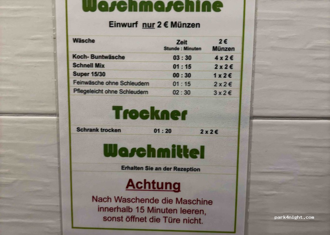 Excellent place. Facilities are spotless and modern. Washing machine €2, dryer €4. Staff lovely and really nice to be able to use campsite facilities but not pay the high price. Lovely lake side walk, 20 minutes, to a very pretty town. Brilliant Wi-Fi.