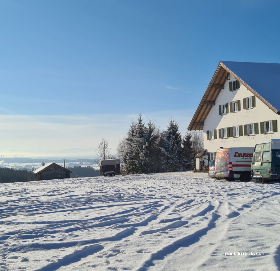 Traumhafter Blick auf die Alpen. Sehr netter Besitzer. Die Nacht war sehr ruhig und wir nur gelegentlich Pferdeschnauben da wir direkt an der Koppel gestanden sind. Am Abend waren ca. 30 Pferde auf der Koppel vor unserem Kastenwagen.