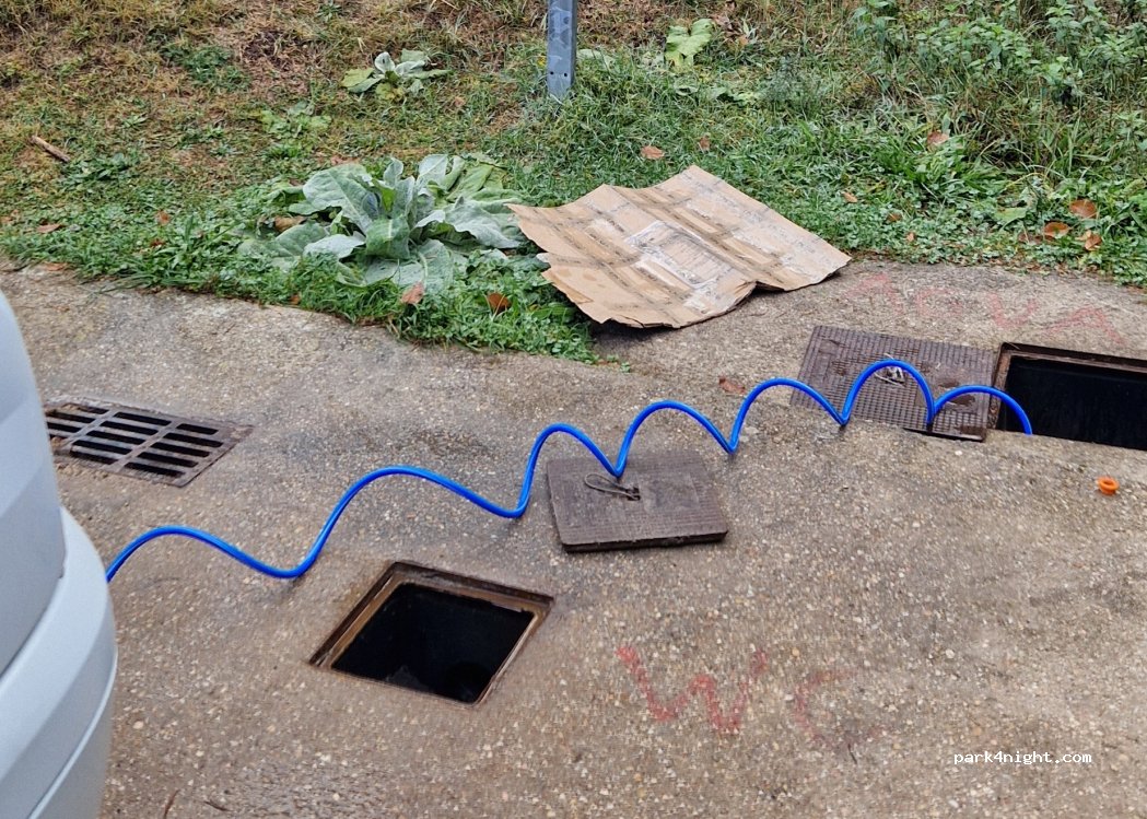Avis mitigé... Parking de la piscine en contrebas de la route. Stationnement autorisé 48h. Interdit de sortir table et chaises. Point de vidange eau grise juste devant entrée de la forêt magique... Eau potable à l entrée du parking. Robinet à poussoir. Pas moyen de brancher tuyau