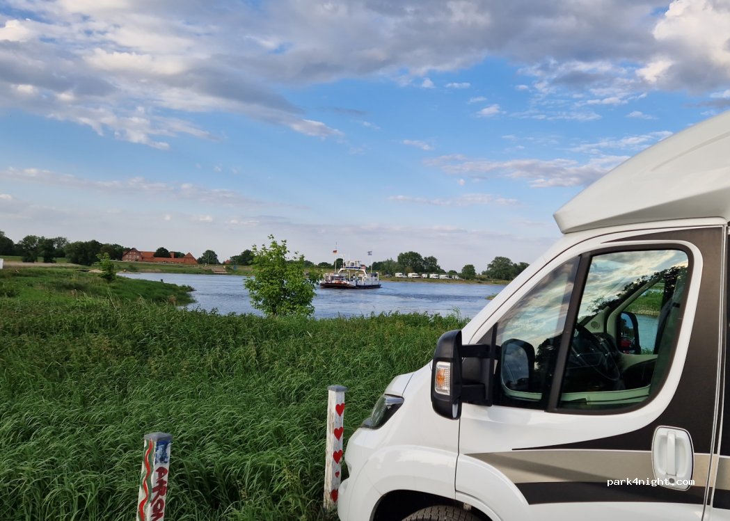 Parkplatz mit abgetrenntem Bereich für Wohnmobile zwischen Fähranleger und Hafen. Nachts total ruhig und dunkel. Das Kunst-Areal mit den Klangschalen ist nett gemacht. Schön, dass es so etwas gibt. // Wir stehen lieber auf der anderen Seite der Elbe direkt am Fluss.