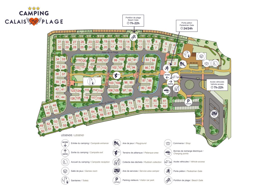 Reception Reception: 9:30 a.m./1 p.m. - 2:30 p.m./5:30 p.m. (low season) 9:30 a.m./1 p.m. - 2:30 p.m./7:30 p.m. (July and August) The campsite welcomes holidaymakers and tourists, whether in tents, caravans or motorhomes. Very close to the beach and the city center. It has two sanitary buildings equipped with showers, toilets, sinks in the cabin, dishwashing tubs, laundry tubs and baby area. Several play areas have been set up, including one for children with different structures, a petanque area and a common entertainment room. During your stay, you can discover the various sites to visit and take advantage of the many activities organized by the City of Calais throughout the summer, in the city center and on the beach. An urban transport network, near the campsite, provides access to the main roads. Nearby bike path, hiking trails... Access to the campsite is secured by an automatic barrier and the presence of a guard.