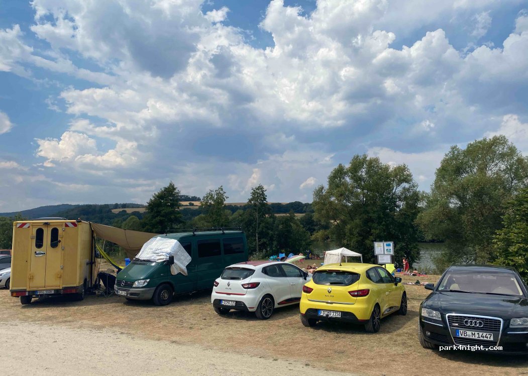 Übernachten ist verboten. Der Platz muss um 22 Uhr verlassen werden und darf erst um 6 Uhr morgens wieder befahren werden. Das Ordnungsamt kontrolliert regelmäßig. Tagsüber ein wunderschöner See mit Nacktbadebereich.