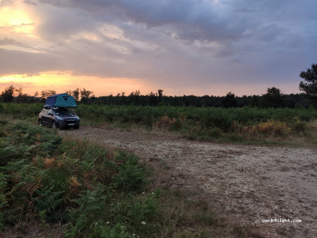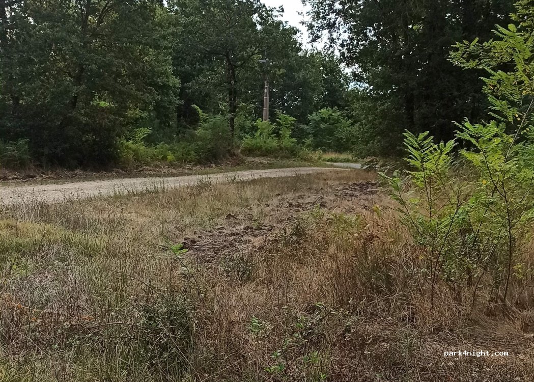 Recess, clearing, at the edge of a dirt road in the middle of a pine and fern forest, road 200 m away with little traffic. Quiet place. Peaceful night, hares, cicadas and birds. Cool night even in August. Accessible even car campsites.