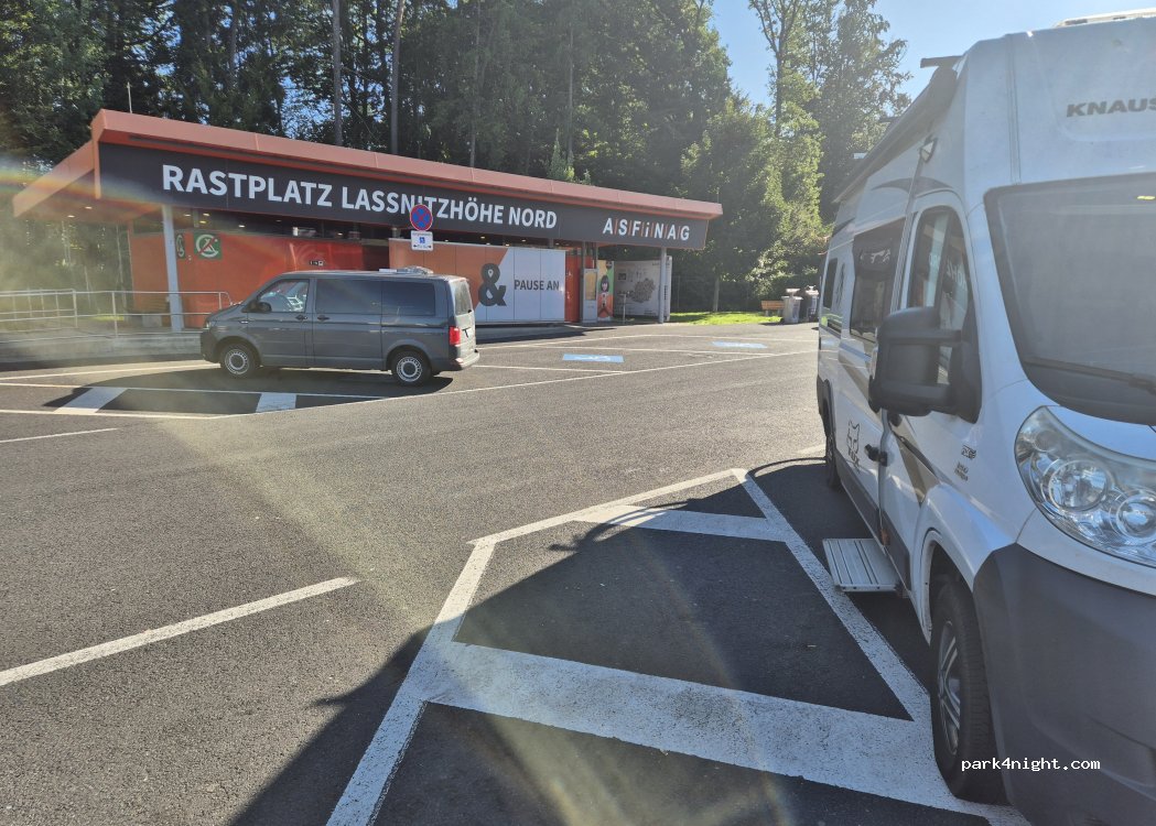 A suitable place to spend the night. Clean toilets, drinking water, well-designed seating, free Wi-Fi. There are wheelchair accessible toilets (also clean). Is not allowed to sleep outside the car/bus/caravan. A little noise from the highway and when the bus comes.