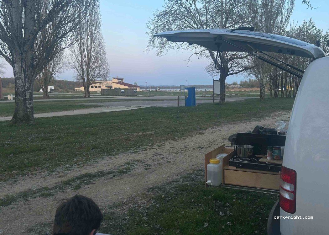 Aire simple, calme y avons passé une bonne nuit. Boulangerie le matin. Balade à pied et tour du lac en vélo. Bien pour les pêcheurs. Parfait