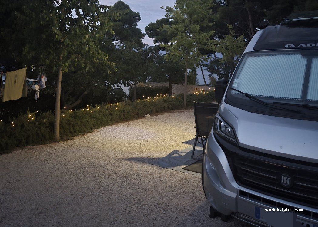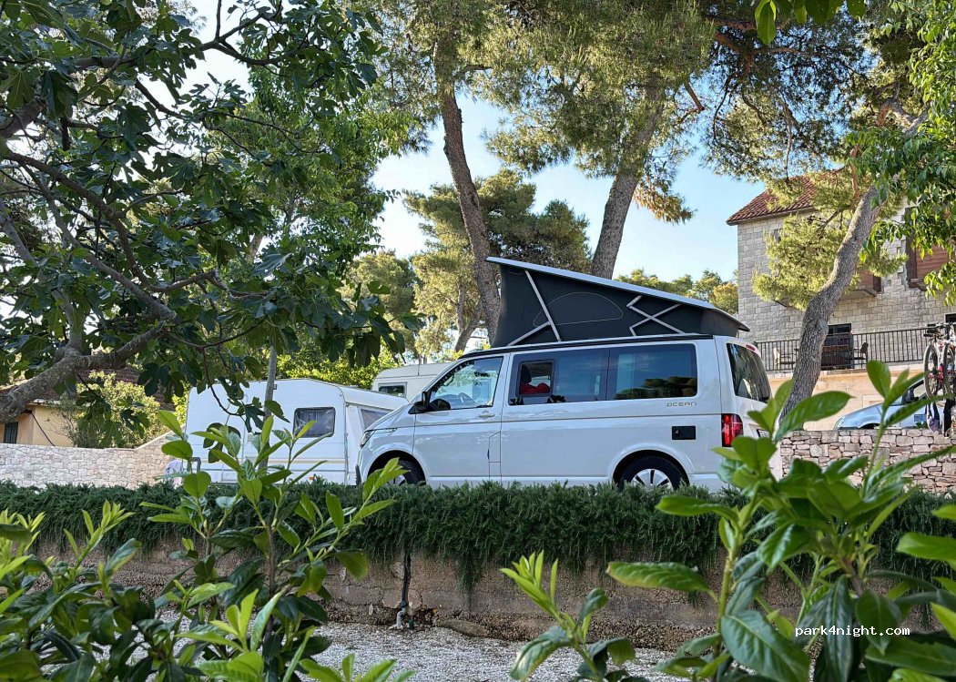 Nice small camp, room for 4 Van's and some more tents. Small kitchen with fridge, stove, sink. Clean bathrooms with washing machine. Some spots have fig tree shade (tents), wifi works at the house, 1min walk to beach, 10min to town. 120kn for 2 people, 1 tent , 2 motos.