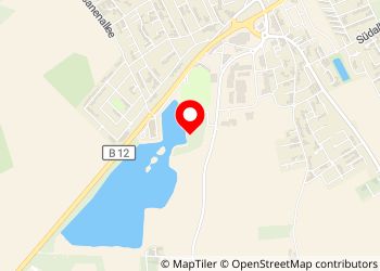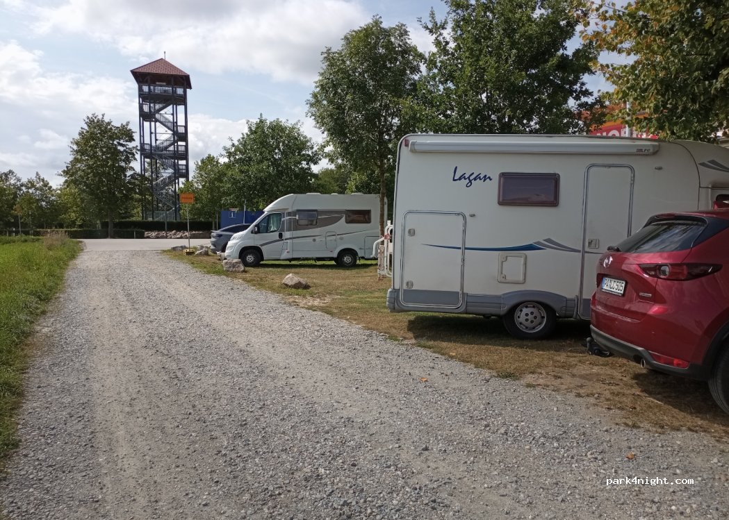 Free parking near the shopping center and lake with beach, playground, kids pool, bistro, toilets and outdoor showers. Entrance free, open 8:00am-8:00pm. Or you can park directly at the shopping center parking (1,5h limit, but as it is almost vacant nobody cares). Cross the street there's paid parking lot for cars up to 2,1m high (barrier). As well as an observation tower. 500m further offical camping site. Cycle path nearby. Really recommend this place at least for day stop.