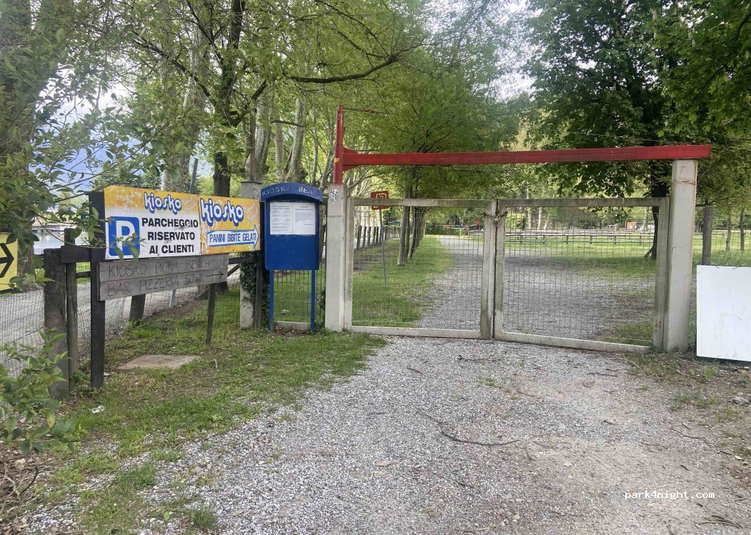 Magnifique endroit avec un grand parking et de l’ombre sous les arbres mais assez venteux. Plage d’herbe prisée par les italiens avec délicieuses pizzas au kiosque. Attention, il faut payer (en allant au kiosque) pour ce spot et bien afficher le ticket sur la vitre car ils vérifient. Nous avons payé 10€ la nuit et 5€ la journée. Location de kayak. Pas d’eau ni prises. Ouvert jusque 22h.