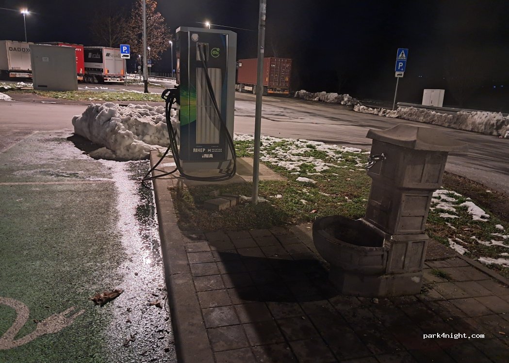 Des deux côtés de l'autoroute se trouvent des parkings avec station-service. Les toilettes sont sur la station. Grand parking pour voitures, bus et camions. Bon endroit pour passer la nuit ou faire une pause pendant le trajet.