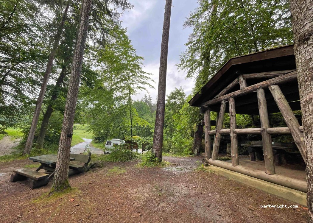 Platz neben einer kleineren Landstraße. Nachts quasi kein Verkehr. Platz ist größtenteils sehr schief. Für größere Wohnmobile stehen nur zwei Plätze zur Verfügung, außer man parkt quer auf den Parkplätzen, die nur PKW-Länge haben. Ein Platz auch für WoMo mit 8,5m Länge / 3,5m Höhe geeignet, da ein Parkplatz eine Lichtung im Rücken hat. Kein TV-Empfang. Nur 100m bis zum Entenstein (Wanderung).