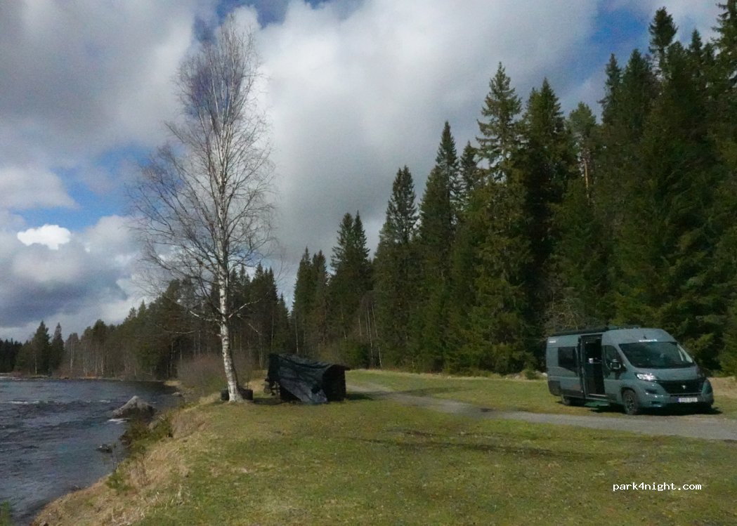 Rastplatz, an dem Sie für die Nacht parken können. Schöner Ort entlang eines Flusses. Nur Parken, kein schicker Luxus. Angeln während der Saison. Angelschein erforderlich!