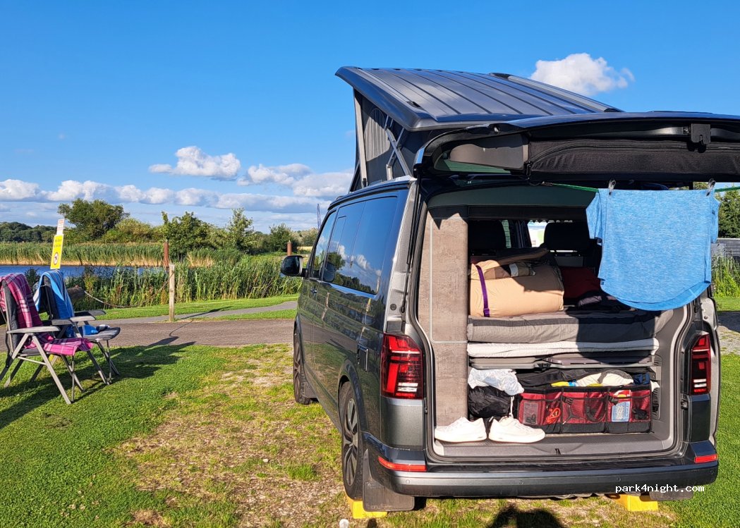 Scenic spot by small marina used to break journey from Hirtshals ferry to Hook of Holland ferry. We rang ahead to check availability, as we knew it is extremely small..as far as we can see just room for 4 campers behind the River Eider on grass/gravel. Great facilities- toilets, basins showers ( 50c) washing mc. 2 adults van no elec was €16. Elec is there if you need. Bread service.Great hosts