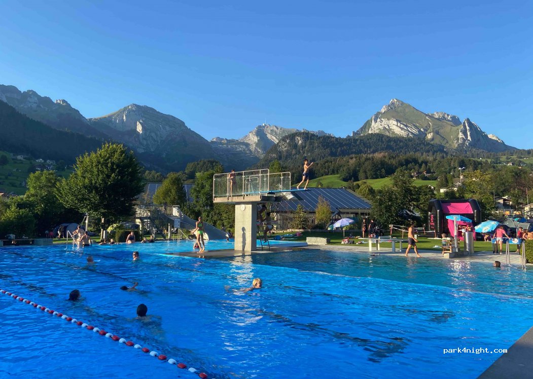 Parkieren auf dem Kiesplatz mit Blick auf die Berge und der Fluss fliesst vorbei. Ticket über Parknsleep lösen für fr. 20.-/Nacht. WC bei Talstation offen. Morgens gleich loswandern oder biken...