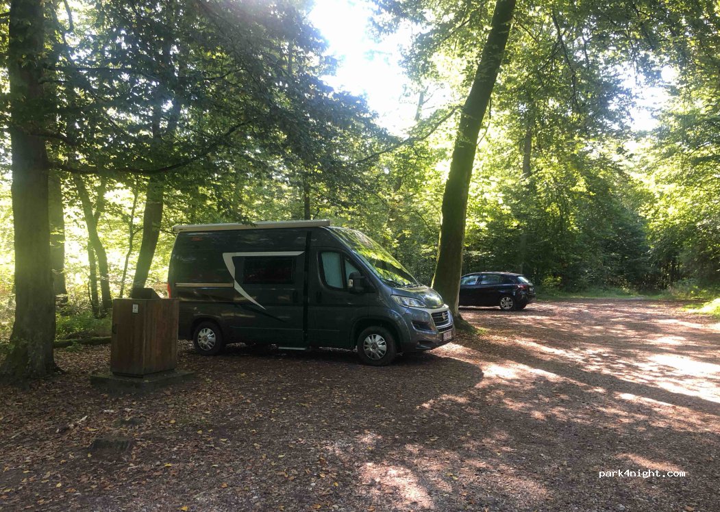 Een kleine parking midden in het bos. De plek naast de vuilbak is zo goed als plat. We hebben er een heerlijk rustige nacht doorgebracht. ‘S ochtends komen er lopers en wandelaars langs.