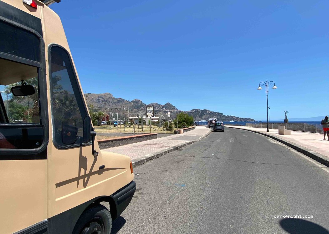 Το μόνο μέρος που μπορέσαμε να παρκάρουμε. Κάναμε και 1 διανυκτέρευση και ήταν πολύ εντάξει. Πολύ όμορφο ξημέρωμα με θέα την Ταορμινα και τη θάλασσα.