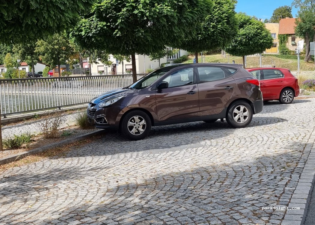 6 places de parking sur la route en face d'un parc. Aire de jeux dans le parc. Poubelle sur le parking. Dans la ville un château d'eau médiéval et des toilettes publiques. Bien pour 1 nuit. Un camping-car plus grand peut tenir en largeur.