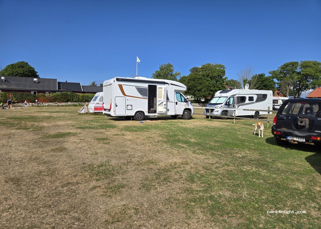 Zwei große Wiesen, links und rechts jeweils neben dem Hauptgebäude mit der Rezeption. Auf jeder Seite ca 10 Wohnwagen als Dauerparker, sonst alles frei. Sehr freundlicher Besitzer an der Rezeption. Pool vorhanden, bis 20 Uhr geöffnet und in Betrieb. Ver- und Entsorgung einwandfrei. Zwischen 8:30 Uhr und 9:30 Uhr gibt es ein einfaches Frühstück im Frühstückssaal für 100 SEK.