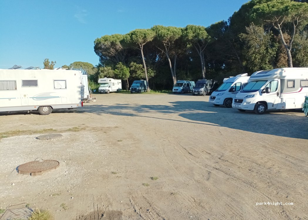 Ampio parcheggio sterrato, senza servizi, con carico e scarico. Vicino al mare e alla pineta, molto bello. Gratuito in bassa stagione. Ottimo!