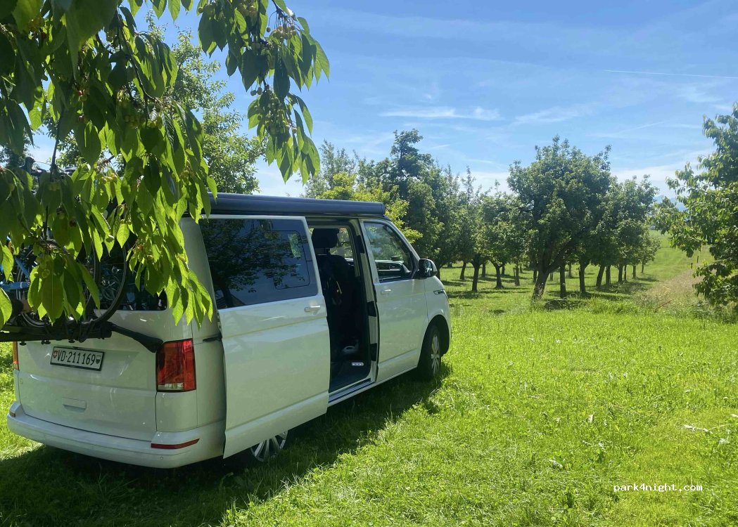 nous nous y sommes arrêter après la visite de Constance accueil à la ferme exceptionnel le monsieur très gentil , parle français nous accueillis dans un verger. présence de vaches, lapins, cochons .... nous avons payer 20 euros ( très correct ,vue l acceuil) présence de douche et WC ( nous n avons pas utiliser car autonome). je recommande