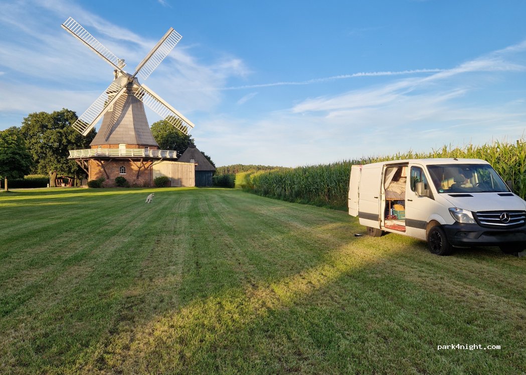 Meadow in front of a gallery Dutch windmill. Like the mill, the meadow is looked after by a mill and local history association, so exemplary guest behavior is a matter of course again. At times of the year when the surrounding maize fields are sufficiently overgrown, it is quiet and barely visible. The Mühlenschänke restaurant is within walking distance.