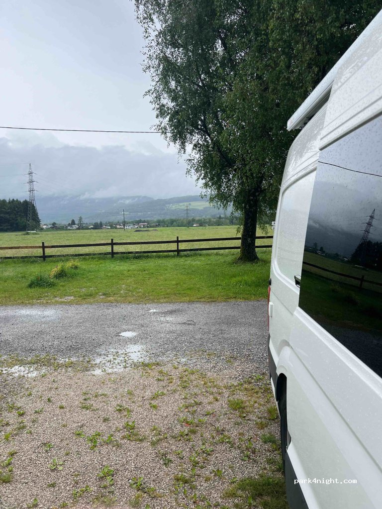 Plätze auf einer großen Wiese, mit Strom! Etwas laut durch den Straßenverkehr! Tolles Panorama auf die Berge. Haben 34€/Nacht, 2 Pers/ WoMo bezahlt