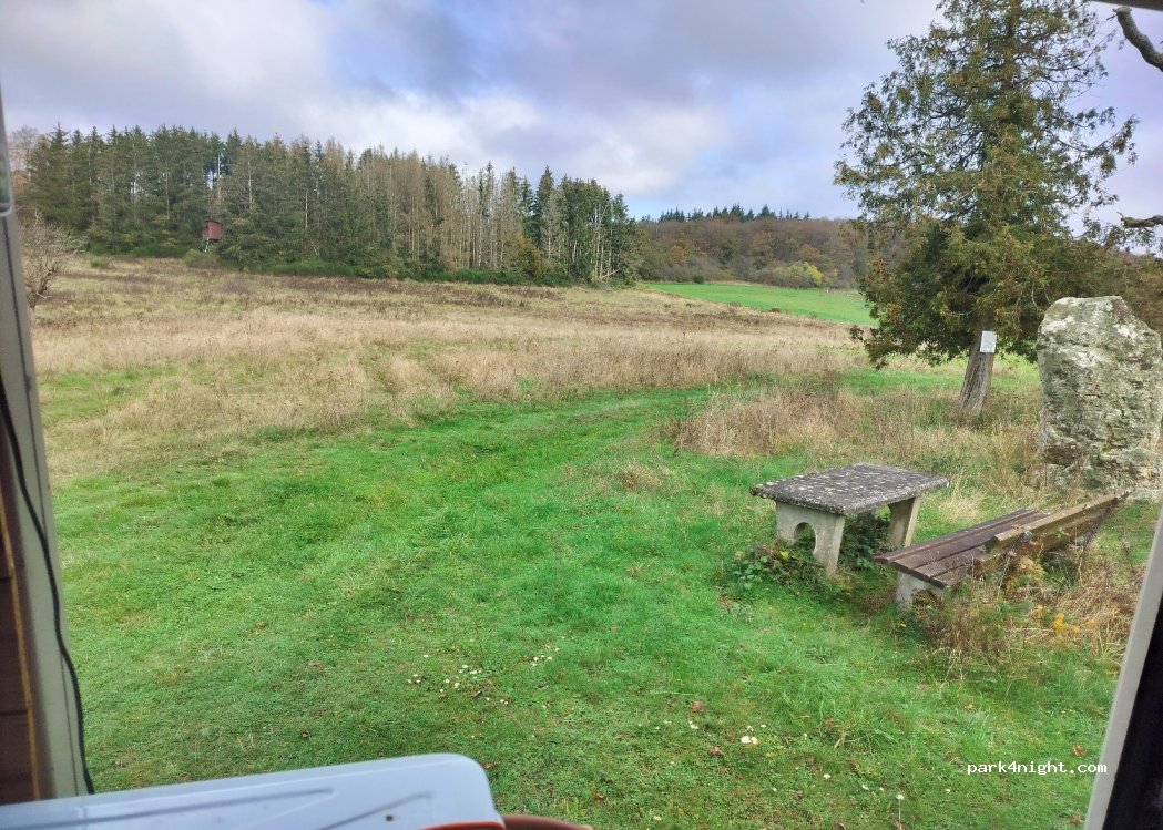 Petit spot un peu en retrait de la route. Au beau milieu des champs, un petit banc en pierre et une jolie vue. Espace pour 3 véhicules. Calme la nuit. Très agréable.