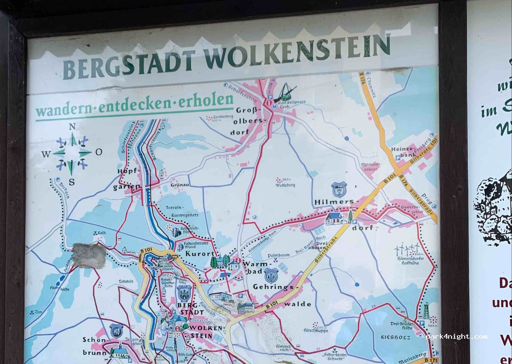 Wolkenstein. Öffentlicher Parkplatz, an der Straße sind die Plätze eben. Hinten durch sehr leise und schräg. Es gibt Mülltonnen.