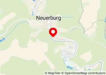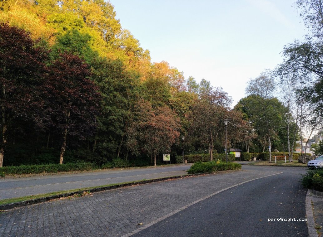 Neuerburg, Parkplatz am Notersberg. Verdeckt hinter Hecken zwischen Ortsdurchfahrtstraße und Enz, abends jedoch sehr ruhig u für einen Ortsbesuch, Wanderung, eine Nacht o.k.
