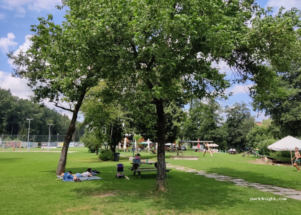 Large space right next to a free bathing river with cold water showers, a small snack / bar + toilets, tap drinking water and a barbecue in the skate park next door