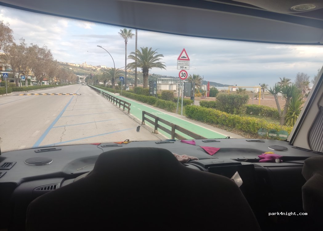 Parcheggio sul lungomare, vuoto e tranquillo ad Aprile. I parcheggi sono per lo più a spina di pesce, inadatti ad un camper, però completamente vuoti in questa stagione, per cui in molti ne occupano più di uno senza creare disagi a nessuno.
