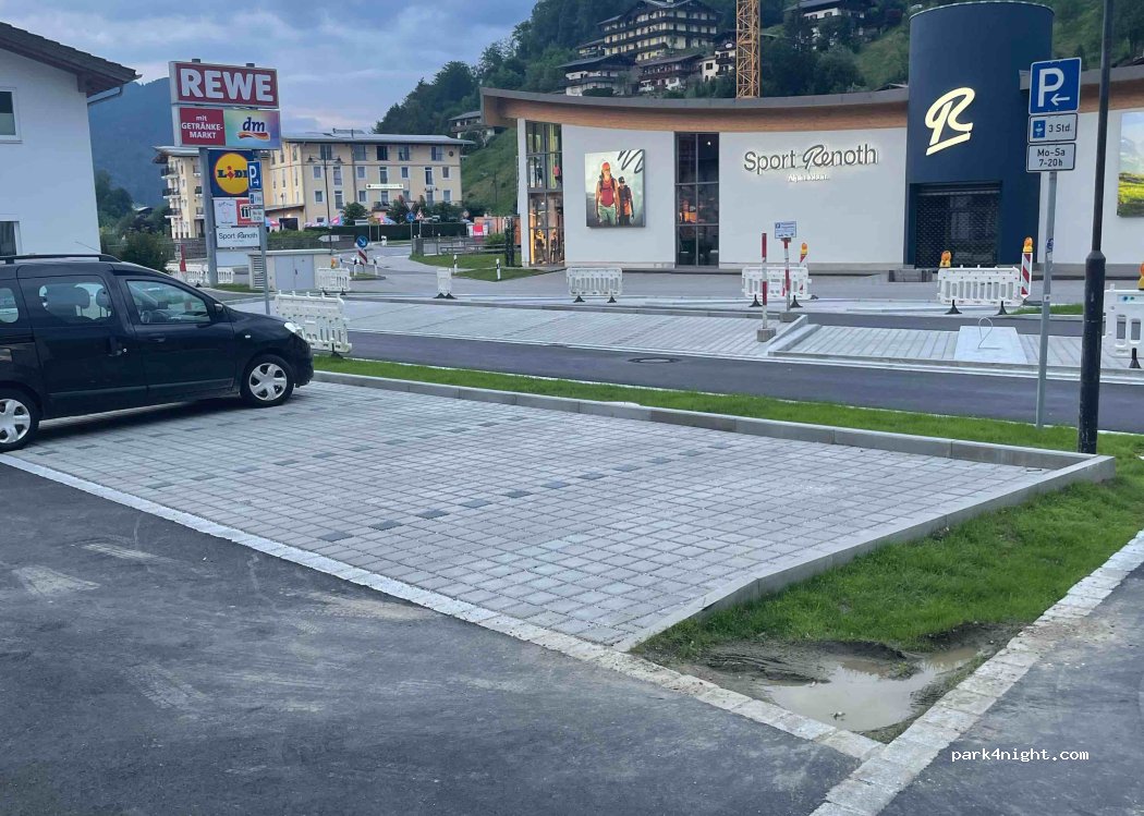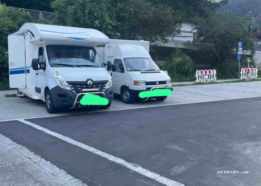 Es ist ein Parkplatz direkt neben den Einkaufsmöglichkeiten Lidl, Rewe, DM, Intersport. Zwischen 20-7 Uhr kann man hier kostenlos parken, auch für größere Wohnmobile gedacht. Meins ist 8m, war gar kein Problem. Am Tag muss eine Parkscheibe rein gelegt werden. 3 Stunden darf man parken. Nachts war es sehr ruhig, morgens hört man dann die Menschen die Einkaufen. Kein V/E/Strom.