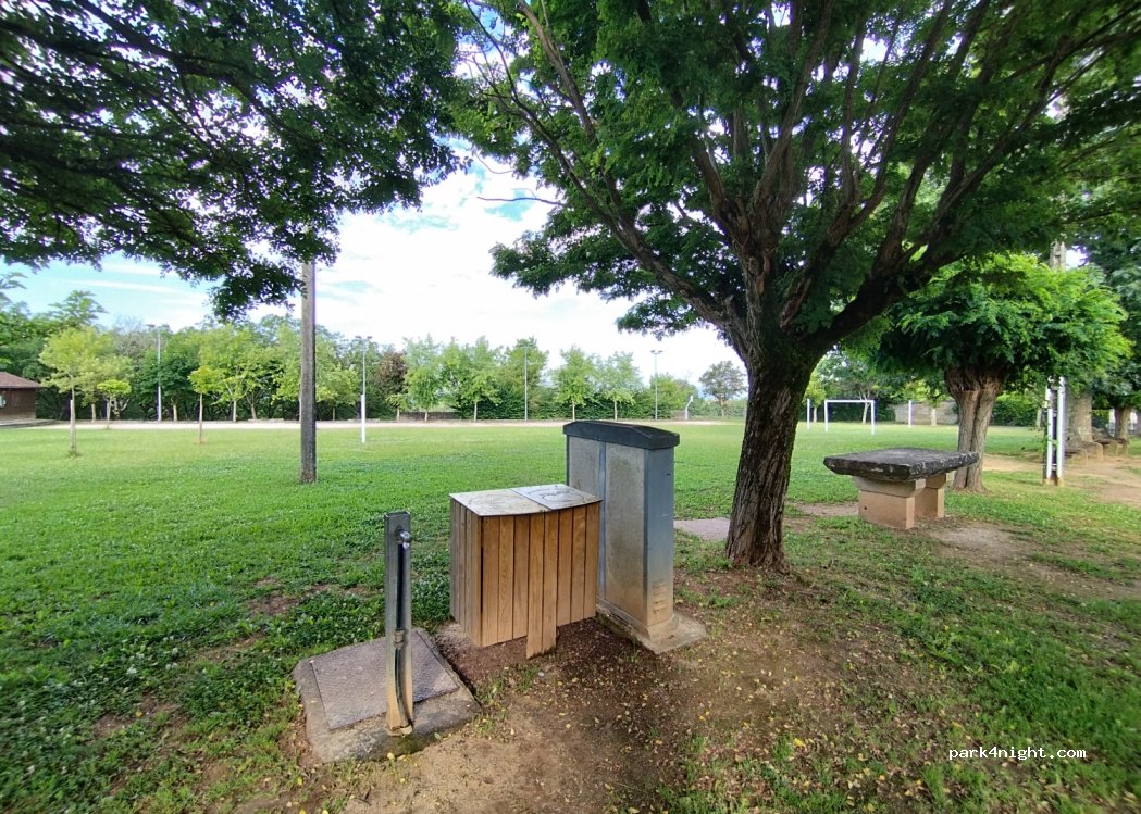 Endroit top : aire de jeux, terrain de pétanques, toilettes propres, tables de pic-nique, robinet et poubelles. Les cloches de l’église se mettent à sonner à 7h