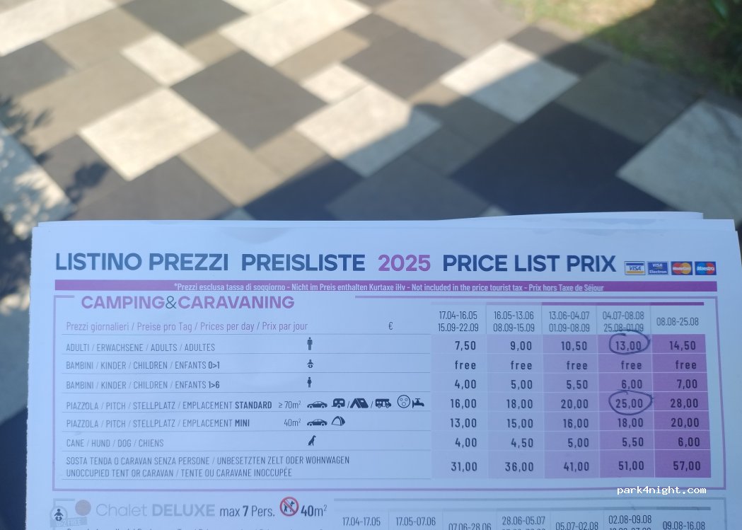 Vraiment bien tarif ACSI 26 euros avec les taxes , parfait de l’eau à chaque emplacement spacieux et plage à 100 mètres vraiment bien. Accueil sympa et en français ! Chioggia à 15 mn en vélo avec en partie des pistes cyclables.
