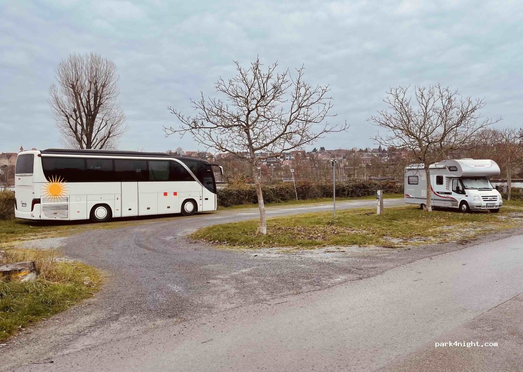 Petite aire de 8 CC sur herbe toute proche du Neckar, au bord d'un chemin où peuvent passer qq voitures et à proximité immédiate d'une piste cyclable. Dans la journée, l'été, on entend le brouhaha provenant de la piscine de plein air située de l'autre côté de la clôture. Nuit très calme cependant. Nous n'avons pas utilisé les services. Poubelle ridiculement petite. Tarif: 7,50/24h.