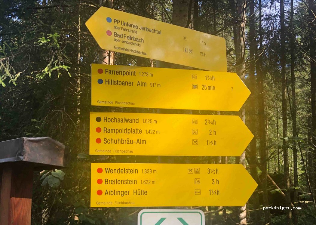 Upper Jenbachtal car park - access road quite narrow and possible with a maximum of panel vans. Take a ticket at the barrier upon entry. You can pay with coins, bills and cards. 4G partially weak possible.