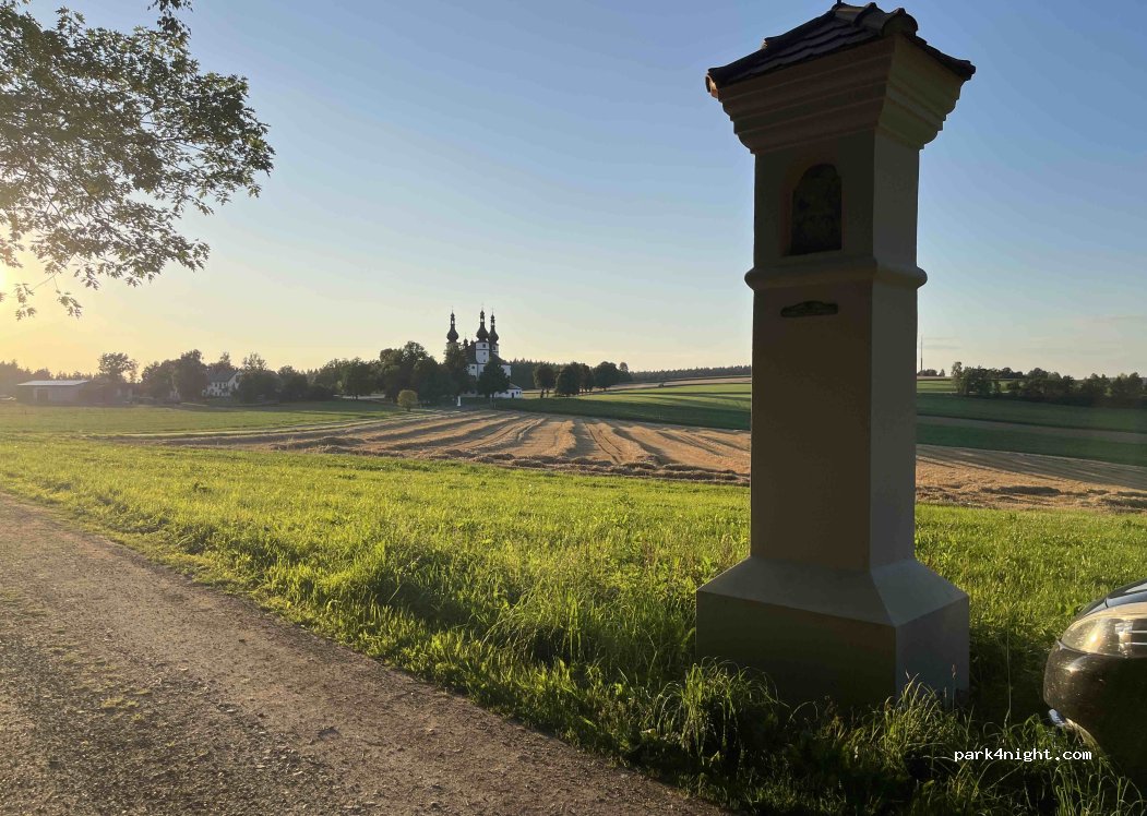 It is a very small place, for one or two cars at most. It's a good place for a quick sleepover. Light traffic in the morning. And people go into the woods, probably to pick mushrooms. Nice view of the church.
