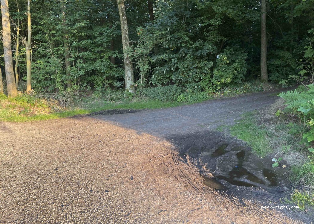 Hier kommt man nur bis 3.5 to hin, weil die Straße eine Begrenzung hat. Man kann direkt am Waldrand stehen, etwas schräg, aber ganz ok. Und nach Anbruch der Dunkelheit ist Ruhe bis 6 Uhr. Da wird dann geläutet. Nettes Plätzchen.