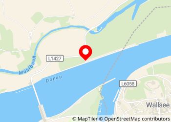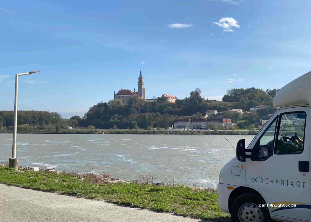 Small bay on the Treppelweg, space for 1-2 mobile homes. Right on the Danube, view of the Wallsee Castle. We spent a quiet night here despite the nearby hydroelectric power station.