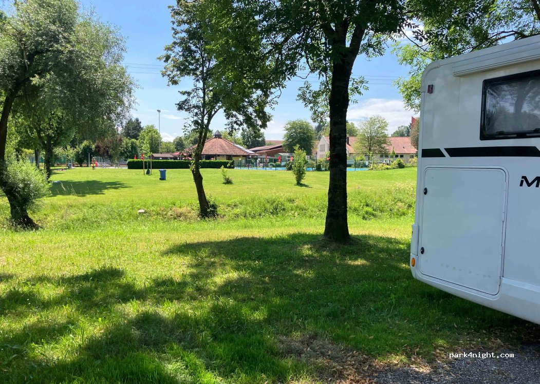Ein super Platz! Dank des kostenlosen Freibads nebenan inklusive kostenloser Duschen und Toiletten. Nacht war sehr ruhig. Morgens ab 8 war es etwas laut aufgrund von Schulbussen und LKWs aber das war okay.