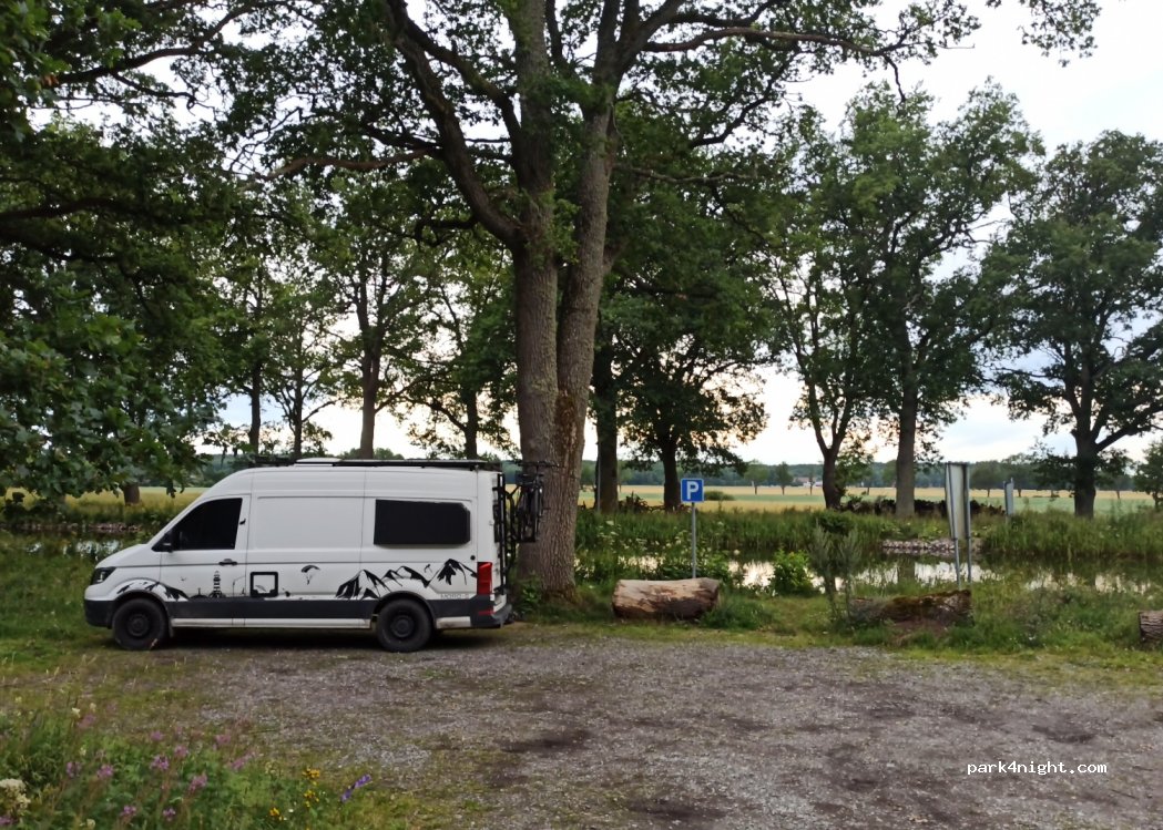 Superfin plats alldeles intill kanalen under en allé av gamla ekar. På andra sidan den lilla vägen finns ett berg med en trevlig 2 km promenadslinga, perfekt för hundpromenader. Plats för två bilar om man inte brer ut sig. Enda nackdelen är att det är sly på marken.