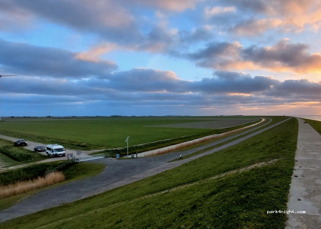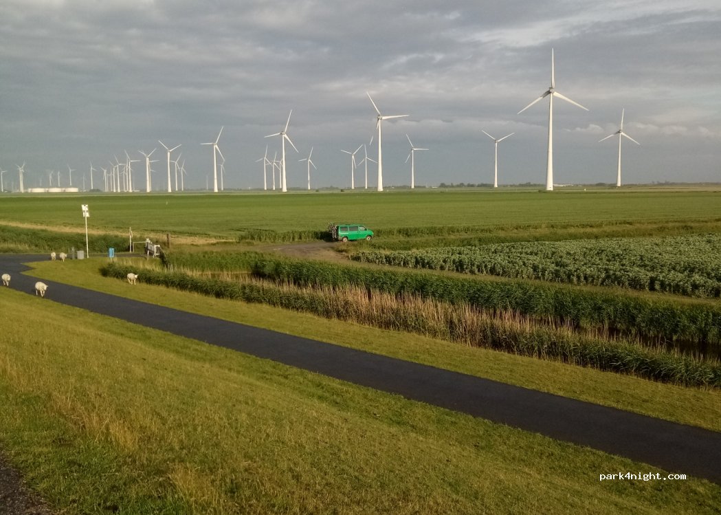 Very isolated nice parking place behind the dyke. You can hear the wind wheels when the wind stands right. The parking lot is next to a small road / path ending with a gate. Quite windy in autumn!