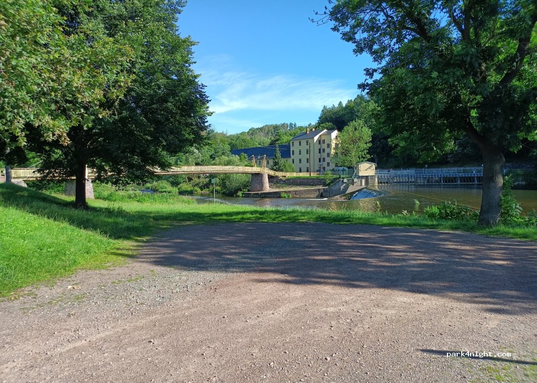 Idyllic place right on the water with a view of the suspension bridge and weir system. But it is not a RV parking space. It is a turning point and fire brigade access. The green areas up and down the river are private properties. The public order office carries out checks every now and then. Nodules not excluded.