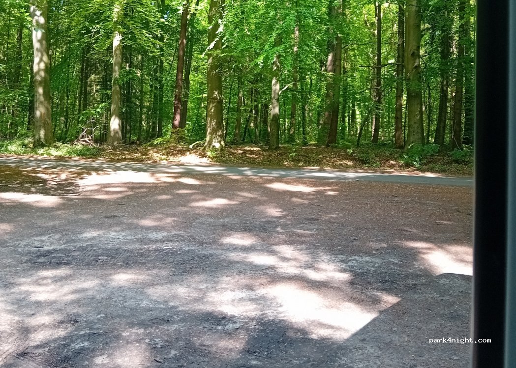 Zone forestière spacieuse en diagonale en face d'une aire de jeux. Convient également aux gros véhicules. Idéal pour une nuit. Il y a peu de trafic sur la route. Quand il pleut, il n'est malheureusement que très boueux et marécageux.