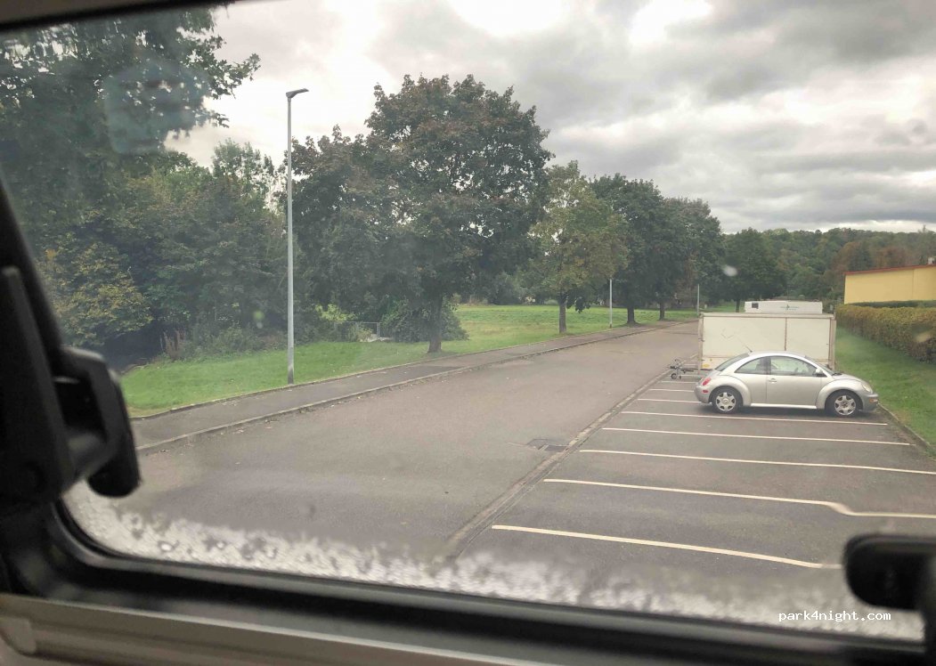 Spacieuses places de parking sur le terrain de sport, très calme dans une impasse, à quelques mètres du Jagst. Super belle aire de jeux à quelques minutes à pied.