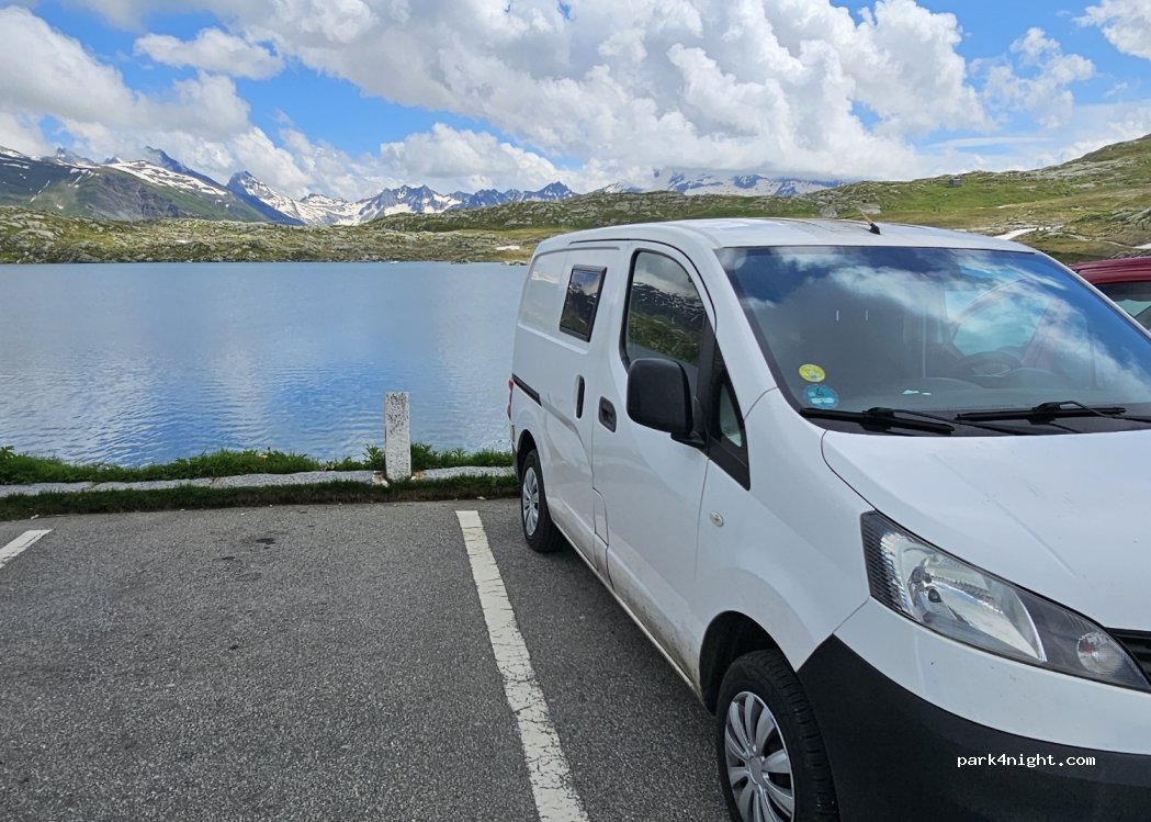 Parking au Grimselpass avec vue sur le lac Grimsel. Réveillez-vous les pieds dans l'eau et payez 10 CHF pour le véhicule et 3 CHF de taxe de séjour pour chaque personne à l'hôtel d'en face.