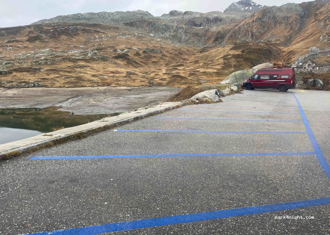 Parking at the Grimselpass with a view of Lake Grimsel. Wake up with your feet in the water and pay 10 CHF for the vehicle and 3 CHF tourist tax for each person at the hotel opposite.