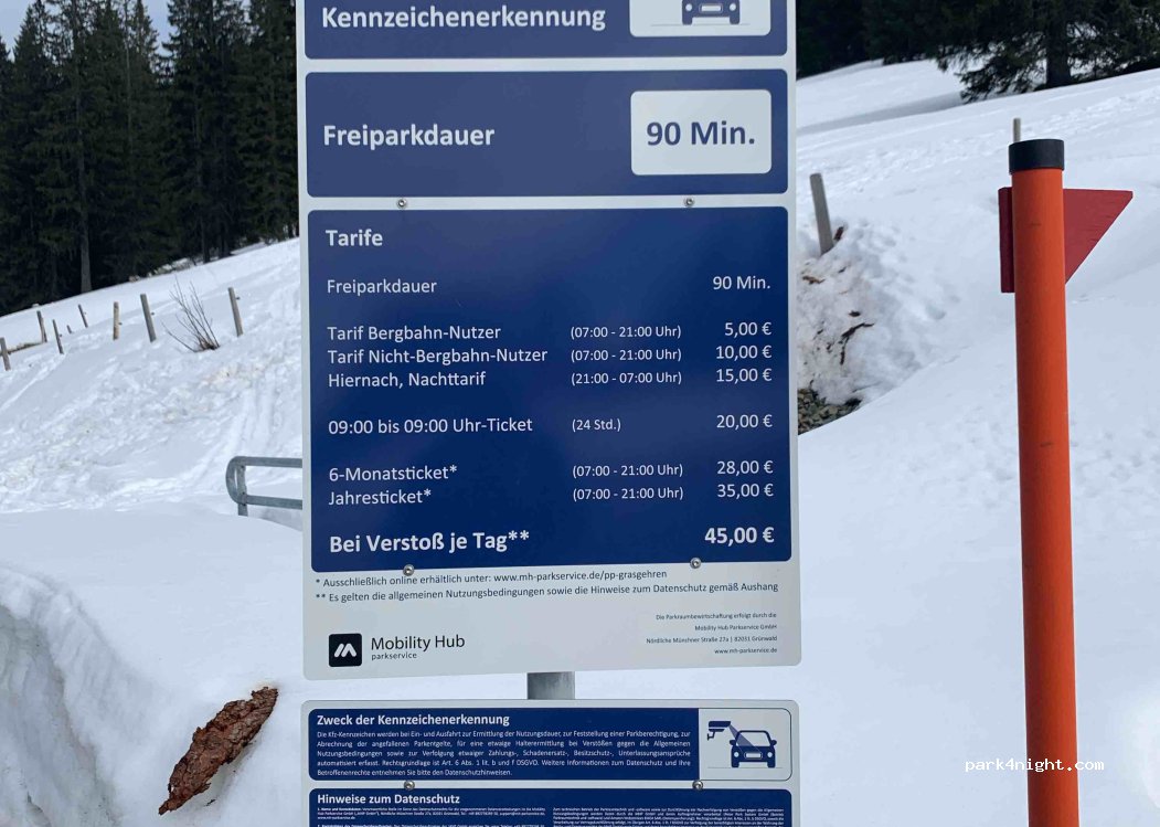 Private parking at the ski paradise, subject to a fee. Overnight stays are now possible, costs 20 euros. Prices have changed, see photo.